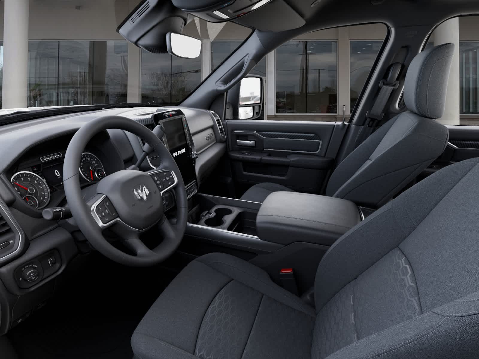BIG HORN LEVEL 2 PLUS EQUIPMENT GROUP Surround View Camera System, Blind Spot & Cross Path Detection, LED Tail Lamps, Red Tail Lamp Bezels, Power Adjustable Pedals, Emergency Vehicle Alert System (EVAS), 12 Touchscreen Display, Glove Box Lamp, Auto Power-Folding Mirrors, Footwell Courtesy Lamp, 115V Auxiliary Rear Power Outlet, Media Hub w/2 Charge Only USBs, Anti-Spin Differential Rear Axle, Drowsy Driver Detection, Heated Front Seats, MOPAR Deployable Bed Step, Exterior 115V AC Outlet, Alexa Built-In, Active Lane Management System, Forward & Reverse Utility Lights, Locking Lower Glove Box, MOPAR Trailer Camera Wiring w/No Camera, Remote Start System, 9 Alpine Speakers w/Subwoofer, Disassociated Touchscreen Display, Dual Wireless Charging Pad, Trailer Tire Pressure Monitoring System, NIGHT EDITION Gloss Black Nostrils/Mic Black Grille, Tires: LT285/60R20E OWL On/Off Road, Black Exterior Truck Badging, Wheels: 20 x 8.0 Black Painted Aluminum, Body Color Grille-Surround, Black Interior Accents, Black Wheel Center Hub, Painted Front Bumper, Painted Rear Bumper, PAINTED FLAT WHEEL-TO-WHEEL SIDE STEPS, TRANSMISSION: 8-SPEED AUTO (8HP75-LCV) (STD), ENGINE: 6.4L V8 HEMI HD (STD), BLACK, PREMIUM CLOTH BUCKET SEATS Bucket Seats, Power Adjust 8-Way Driver Seat, Folding Flat Load Floor Storage, Rear 60/40 Folding Seat, Front Seat Back Map Pockets, Power 2-Way Driver Lumbar Adjust, Full Length Upgraded Floor Console. Ram Big Horn with Bright White Clearcoat exterior and Black interior features a 8 Cylinder Engine with 405 HP at 5600 RPM*.